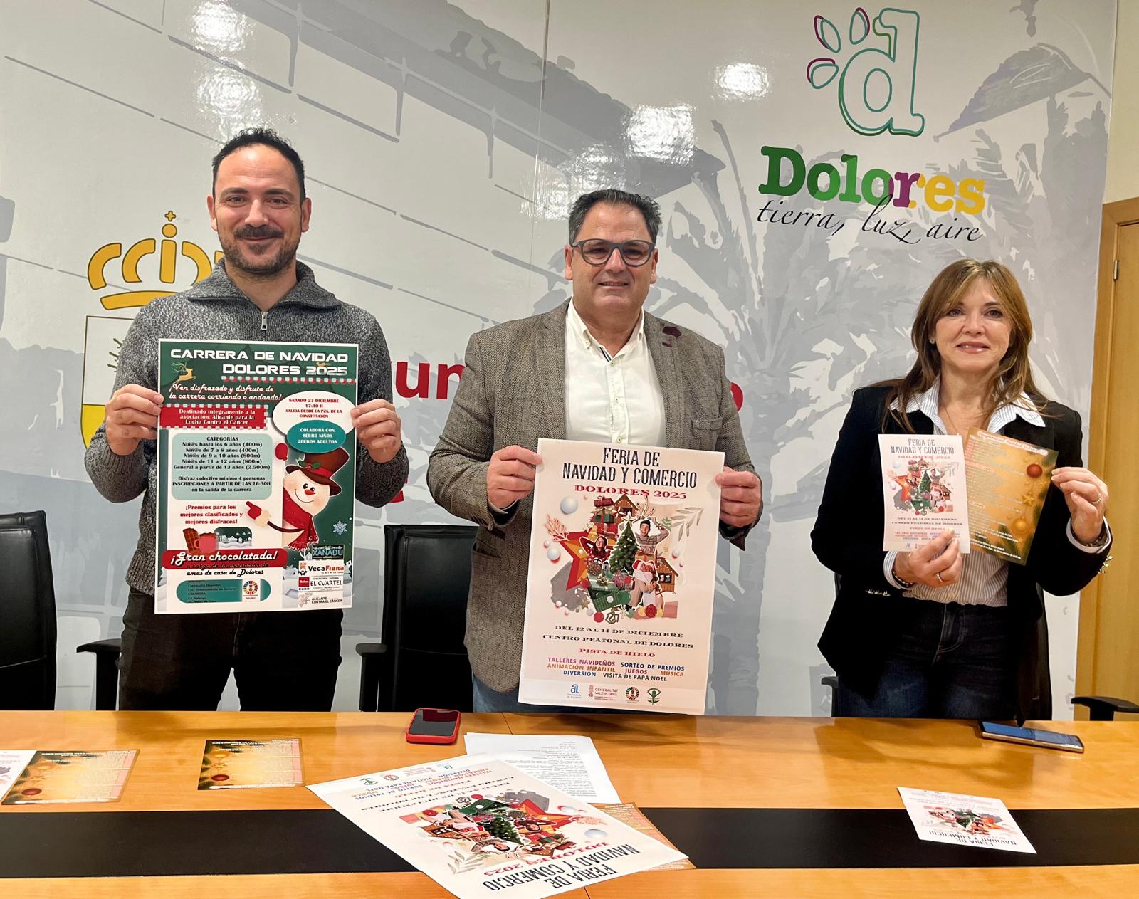 El Ayuntamiento de Dolores ha presentado oficialmente la Feria de Navidad y Comercio 2025, uno de los eventos más esperados por los vecinos y vecinas del municipio. El alcalde de Dolores ha destacado que esta cita “crece y se consolida cada año, convirtiendo nuestras calles en un punto de encuentro para familias, visitantes y, por supuesto, para nuestro comercio local”. A la rueda de prensa han asistido, Joaquín Hernández, alcalde de Dolores; David Nortes, concejal de Medio Ambiente y Montse Pertusa, presidenta de AsemDolores.
