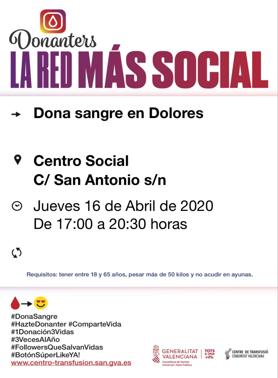 El Centro de Transfusión de la Comunitat Valenciana vuelve a Dolores, mañana jueves a partir de las horas en el CENTRO CULTURAL (C/San Antonio, nº ).