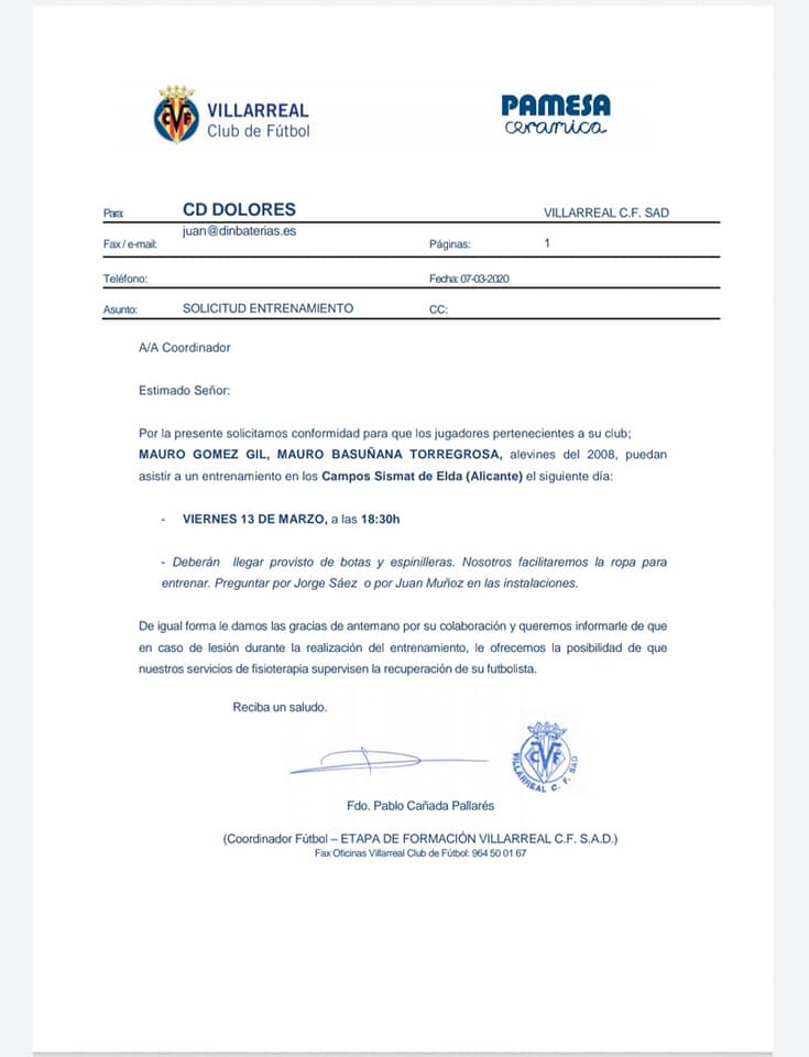Esta semana, los jugadores del ALEVIN A del CD Dolores, Mauro Bascuñana Torregrosa y Mauro Gómez Gil han sido convocados por el Villarreal CF para un entrenamiento que se desarrollará mañana viernes 1️⃣3️⃣ de marzo, a las 1️⃣8️⃣: 3️⃣0️⃣ horas en el ? Campo Municipal Sismat de Elda.