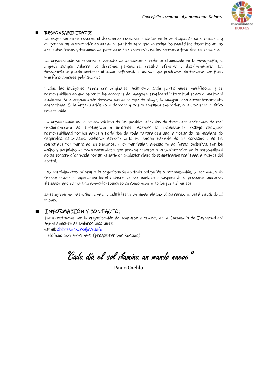 Participantes: Jóvenes de 16 a 25 años. Con cuenta en Instagram y ser seguidores del Ayuntamiento de Dolores, @ayuntamiento_de_dolores. Temática:“Plasmando realidad”- NO hay límite, todo vale (siempre desde el respeto), todo lo que te inspire y refleje lo que sientes en este momento. Deja libre el objetivo e intenta captar lo que más te guste.